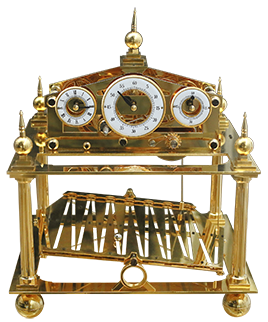 康格裡夫滾球鐘由康格裡夫于1808年發(fā)明,具有較高的觀賞性和趣味性,該鐘仿製於英國德文郡鐘公司製作的滾球鐘。該鐘製作工藝要求較高,採用了條盒動力和擒縱機(jī)構(gòu),分別控制鋼球滾動和走時,解決了走時精度和晃板擺動可靠性兩大問題。滾動鋼球在蜿蜒“之”字槽內(nèi)往復(fù)滾動實現(xiàn)等時觸發(fā)控制指標(biāo)走時,擺輪遊絲擒縱調(diào)速器控制指標(biāo)顯示。