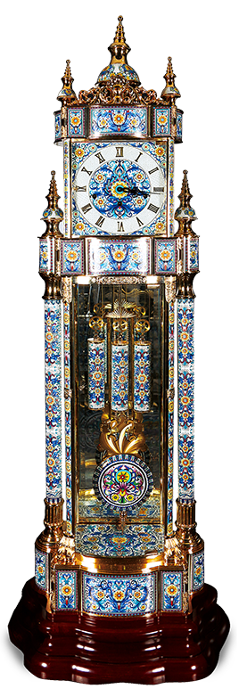 中國工藝美術(shù)大師鐘連盛先生作品。煙臺美時嘉公司製造,此鐘採用我國著名傳統(tǒng)工藝—景泰藍(lán)製作,配以德國原裝十二音機(jī)心,具有音樂報時報刻(西敏寺、聖米切爾、威靈頓三種音樂)、靜音及夜間自動靜音、報時報刻關(guān)閉等功能。