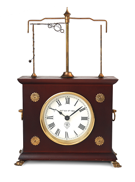 1883年由德國JEROME時鐘公司推出飛行擺鐘。該展品是20世紀(jì)60年代製作的複製品,具有較高的觀賞價值。鐘擺是繩子上的一個圓珠,通過圓珠週期性飛旋帶動擒縱機(jī)構(gòu)而使鐘的指標(biāo)行走,時間的快慢可以通過繩子的長短來進(jìn)行調(diào)節(jié)。